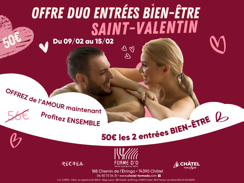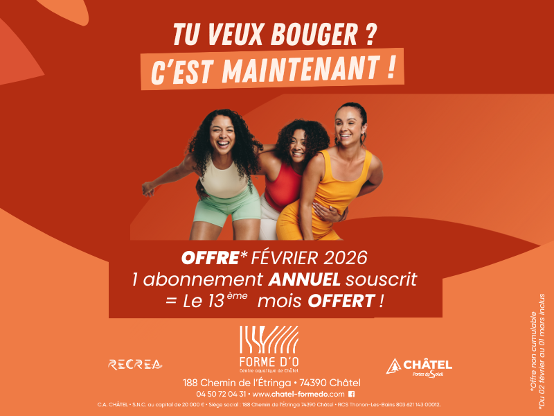 DécouvrirLe centre aquatique Forme d'O se situe à Châtel en plein cœur des montagnes. Son espace aquatique saura satisfaire toute la famille grâce à ses trois bassins : un bassin sportif de 25m pouvant aller jusqu'à 3 couloirs de nages pour perfectionner ses longueurs, un bassin de loisir réservé aux activités et aux enfants, et un bassin extérieur de 200m² ouvert toute l'année. Pour profiter d'une bulle de bien-être, l'espace Océane est accessible à toutes personnes en quête de détente (bassin bien-être, saunas, hammams, douches massantes). Des gommages, massages et soins sont proposés dans votre centre aquatique pour prolonger les plaisirs. Une salle de sport est également à disposition avec appareils de musculation pour se remettre en forme.